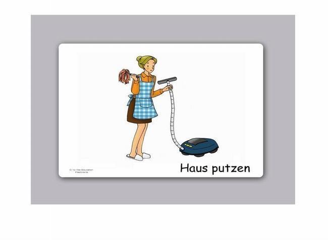 Wortschatz: Haus putzen, Rasen mähen, Geschirr spülen, Wäsche waschen, Staub putzen, Hund füttern, Wäsche falten, Wäsche aufhängen, Wäsche bügeln, Boden wischen, Blätter harken, Boden fegen, Mülleimer leeren, Staub saugen, Hund spazieren führen, Fenster putzen, Auto waschen, Blumen gießen, Garten arbeiten